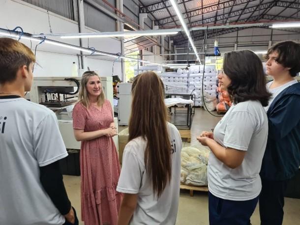 Em outra atividade, os estudantes visitaram a Polo Sul Bonés e Brindes Promocionais. O proprietário e administrador da empresa, Gilberto Almeida da Silva, conduziu os estudantes pelos estabelecimentos da empresa, mostrando o funcionamento da indústria e a diversidade de profissões presentes no setor, além de apresentar os diferentes tipos de tecido, texturas e materiais.