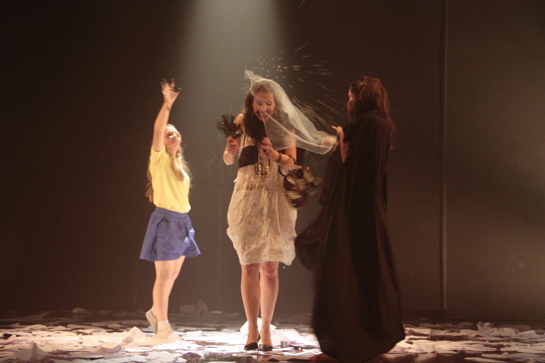 A experiência que abrira os poros da percepção do espectador a uma dramaturgia expandida agora cede à figuração. Roupas, adereços e objetos têm que dizer em nome do que e de quem representam/caracterizam. Ao falar de estigmas as escolhas encenadas são reconhecíveis, de pronto. Cadê a energia que pulsava até há pouco? Isso faz com que, por exemplo, a seminudez das atrizes destoem, porque não à vontade, de costas, perdendo a angulação dos movimentos sem fronteiras.